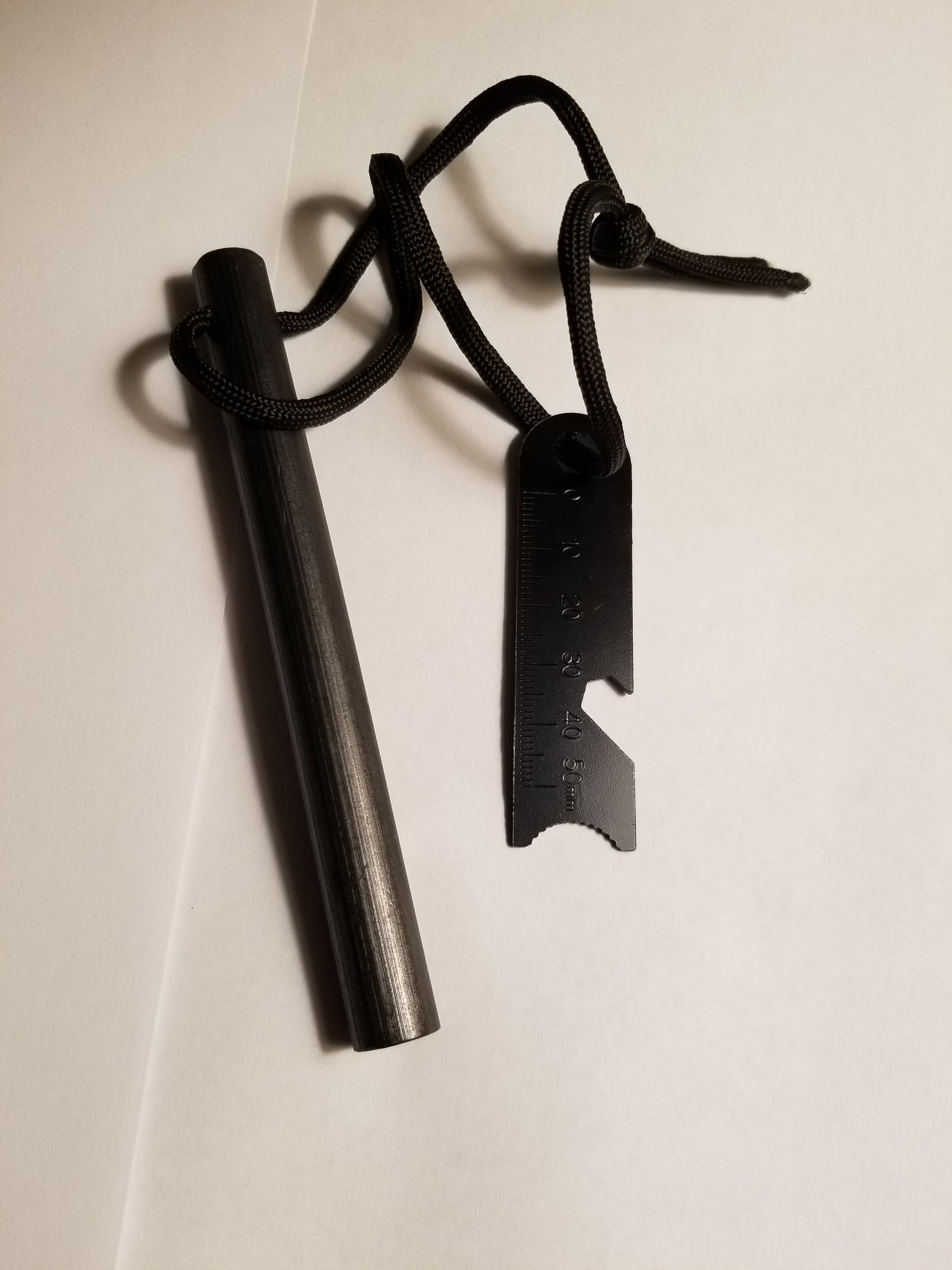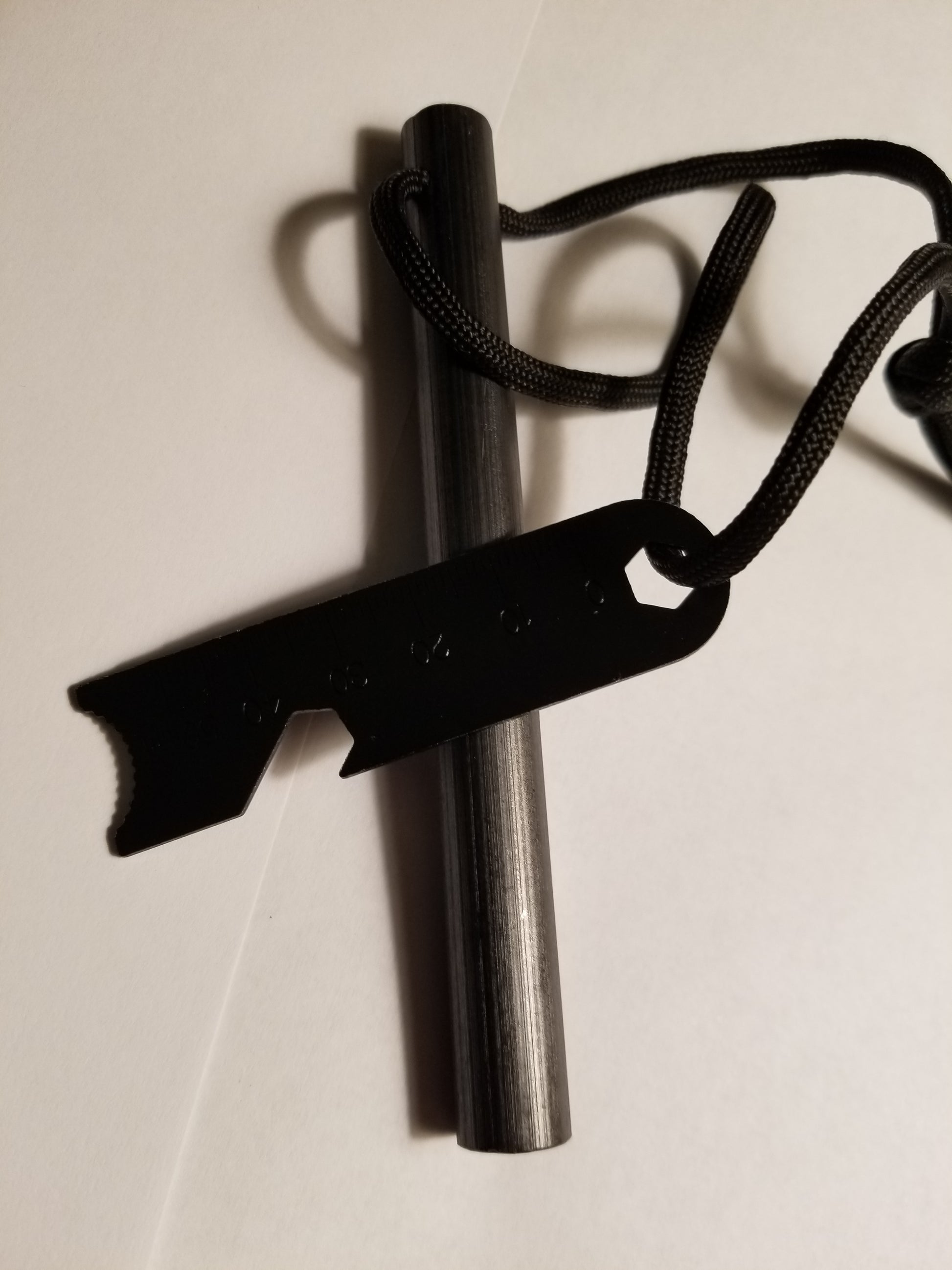 The metal striker has a built in saw ruler, bottle opener, and striker.